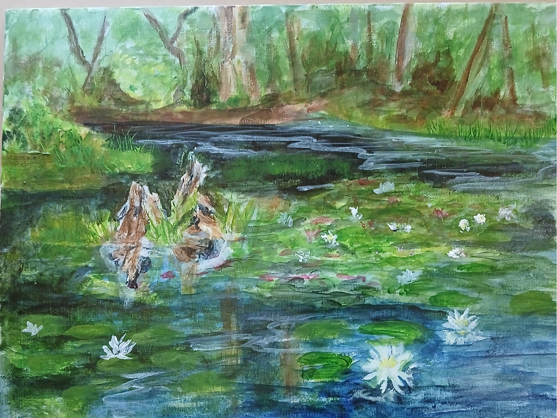 Water Lilies in the Woods - 14x18, Acrylic on board, $300